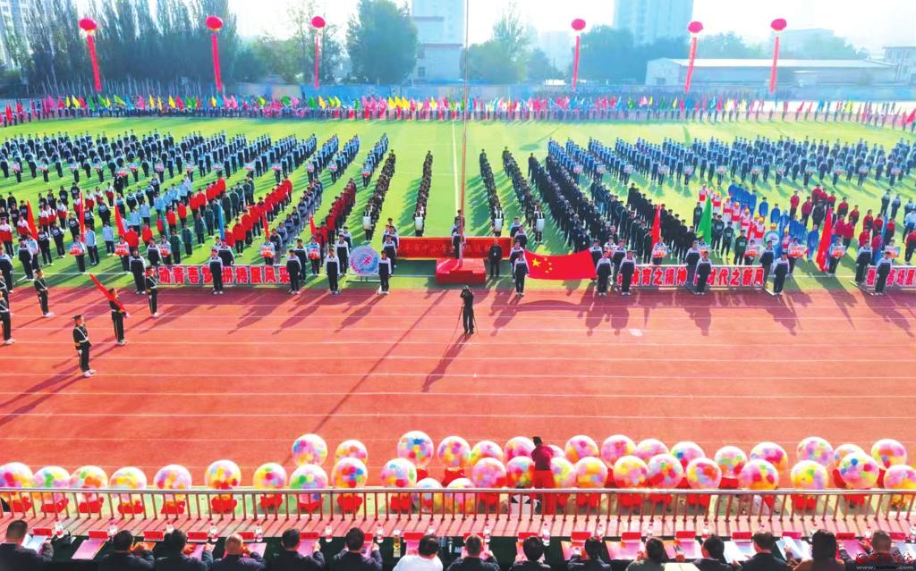 9月28日,原平市范亭中學(xué)校運(yùn)動(dòng)場(chǎng)上彩旗招展、鼓樂(lè)喧天,該市中小學(xué)秋季田徑運(yùn)動(dòng)會(huì)開(kāi)幕,有小學(xué)、初中、高中的38支代表隊(duì)共3000余人參加了開(kāi)幕式。圖為開(kāi)幕式現(xiàn)場(chǎng)。(吉建平攝)