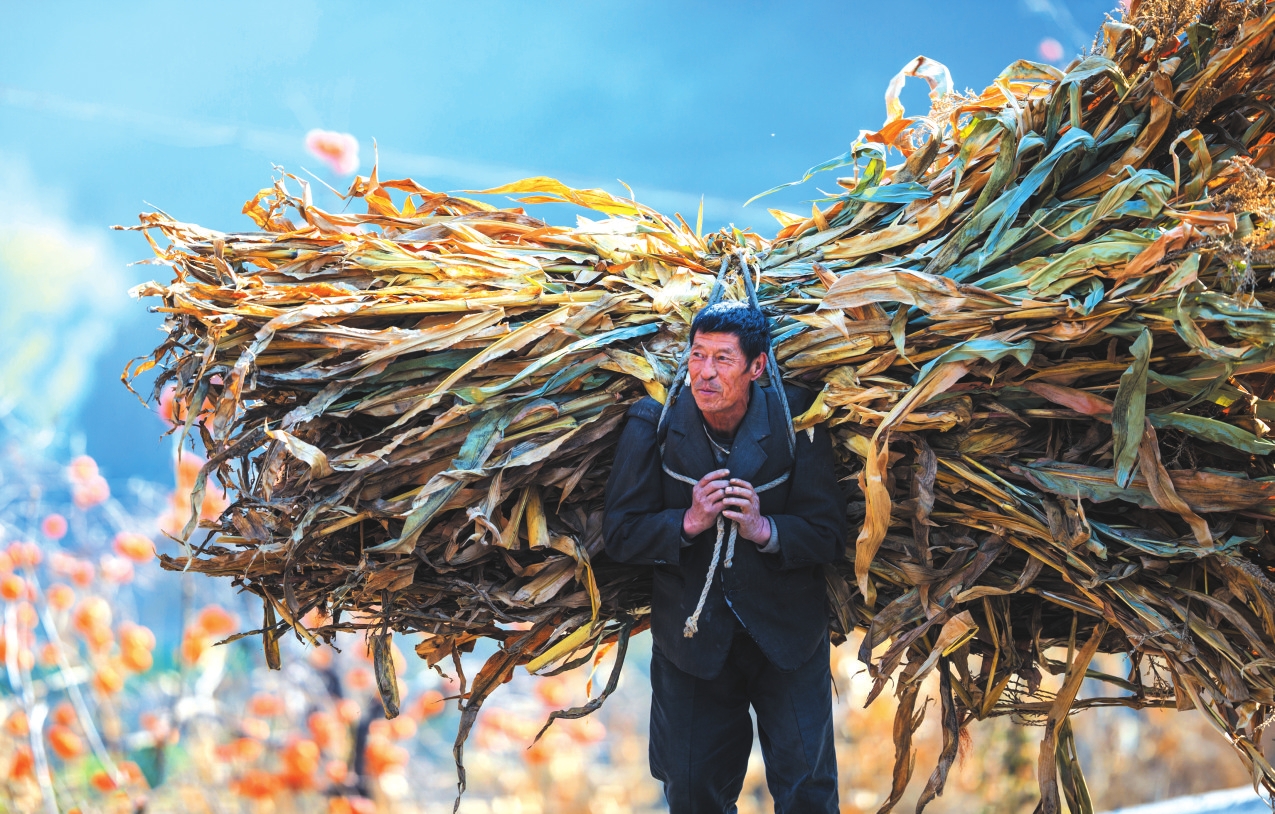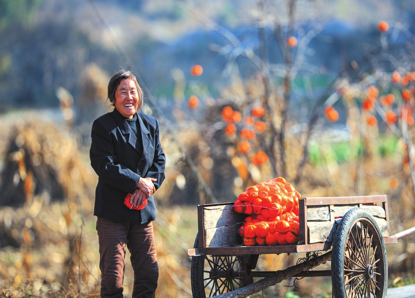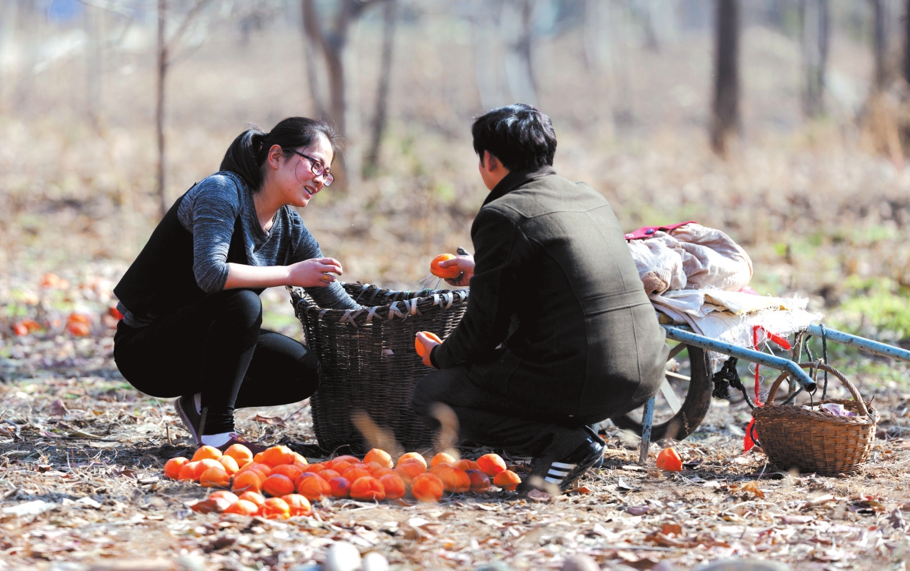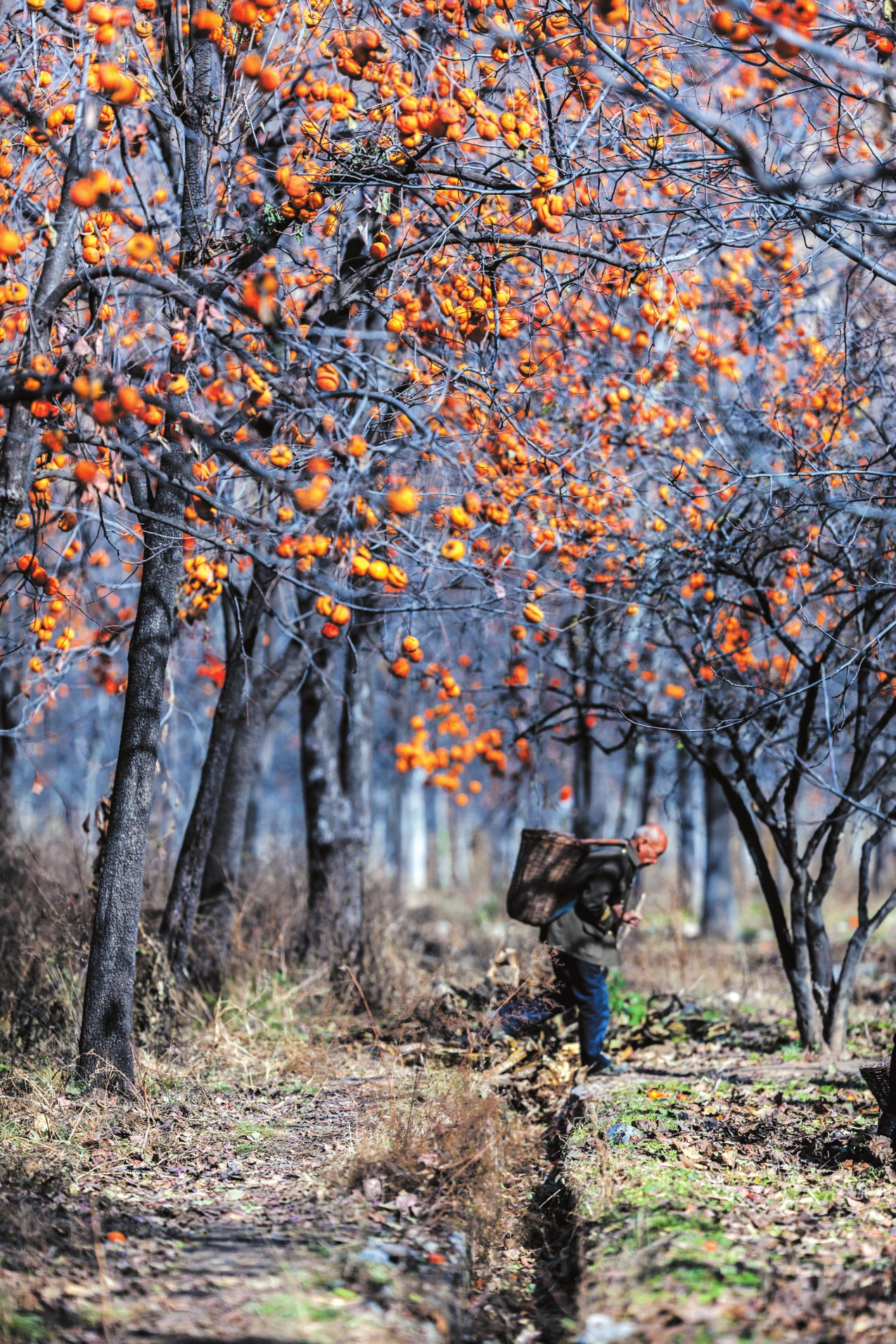 地頭那畔,景象便不同了。一對(duì)年輕的夫婦,正手腳利落地采摘、分揀柿子。竹籃里,橙紅的果實(shí)漸漸堆成小山。他們時(shí)而低語(yǔ),聲音輕得像風(fēng)拂過(guò)枝梢,說(shuō)的或許是今年柿子的成色,盤(pán)算著能賣(mài)個(gè)好價(jià)錢(qián);或許是在憧憬,等這筆錢(qián)到手,該給娃添置些什么。他們額上有細(xì)密的汗珠,眉宇間有勞作后的倦色,但那份倦色底下,卻藏不住一股子蓬勃向上的勁兒,一種屬于明天的、清亮亮的盼頭。