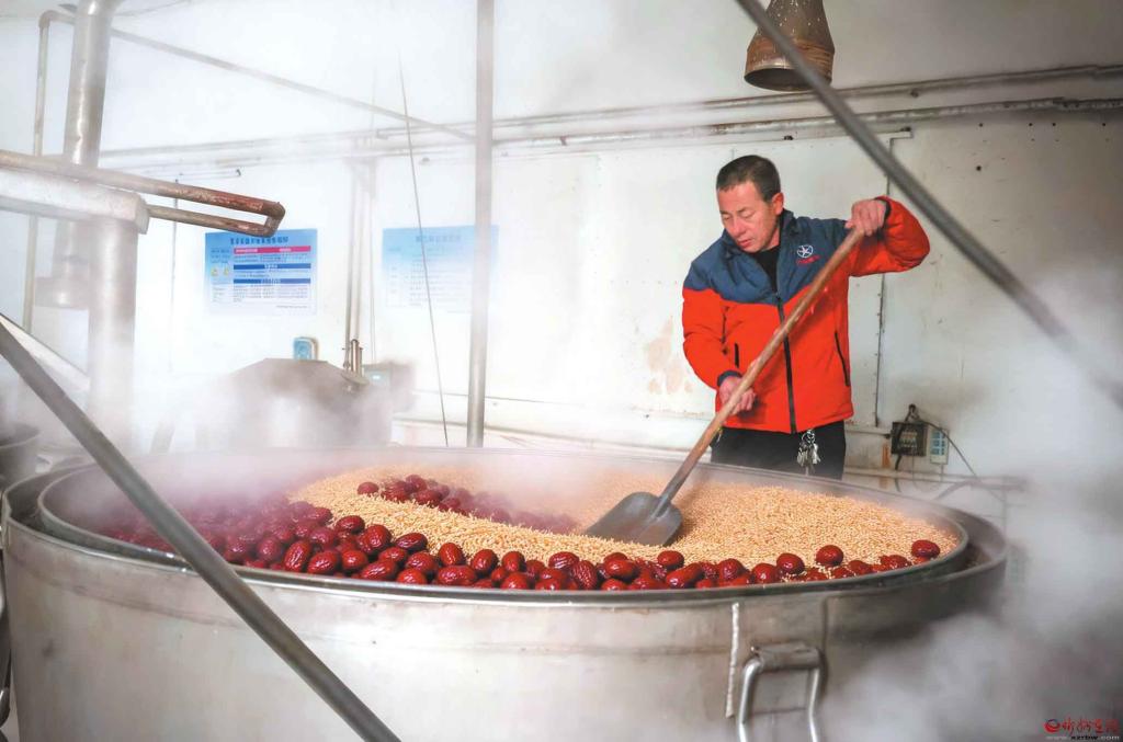 近年來(lái),保德縣貢棗酒開(kāi)發(fā)基地以“保德油棗”與枸杞入酒,不僅更好地保留了果實(shí)的溫補(bǔ)特性,也釀出了獨(dú)特的地方風(fēng)味。該基地不僅是當(dāng)?shù)赝苿?dòng)紅棗產(chǎn)業(yè)深加工、提升附加值的關(guān)鍵項(xiàng)目,也是將地理標(biāo)志農(nóng)產(chǎn)品轉(zhuǎn)化為特色商品、助力鄉(xiāng)村振興的生動(dòng)實(shí)踐。圖為保德縣貢棗酒基地,工人在蒸餾車(chē)間翻動(dòng)攪拌麥殼與紅棗等原料,車(chē)間內(nèi)蒸汽彌漫。(記者 范琛攝