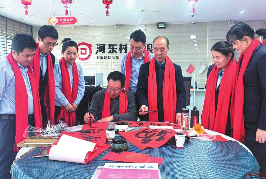 新春到來(lái)之際,神池縣河?xùn)|村鎮(zhèn)銀行邀請(qǐng)當(dāng)?shù)貢?shū)法愛(ài)好者在營(yíng)業(yè)大廳現(xiàn)場(chǎng)揮毫潑墨,為前來(lái)辦理業(yè)務(wù)的客戶書(shū)寫春聯(lián),深受群眾稱贊。(楊晉明攝)