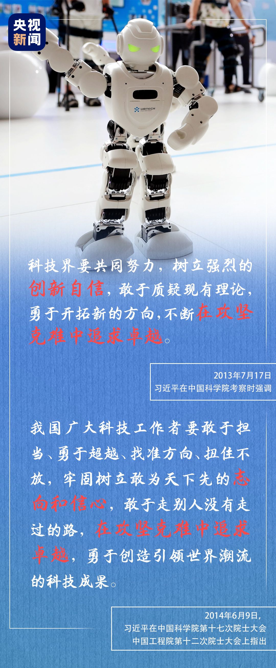 科技興則民族興,科技強(qiáng)則國(guó)家強(qiáng)——重溫歷史,幾多感慨,幾多壯志。自力更生是中華民族自立于世界民族之林的奮斗基點(diǎn),自主創(chuàng)新是我們攀登世界科技高峰的必由之路,創(chuàng)新自信讓我們?cè)谕ㄍ磥?lái)的道路上行穩(wěn)致遠(yuǎn)。自力更生,自主創(chuàng)新——以習(xí)近平同志為核心的黨中央帶領(lǐng)中國(guó)向著建設(shè)世界科技強(qiáng)國(guó)的宏偉目標(biāo)奮勇前進(jìn)。