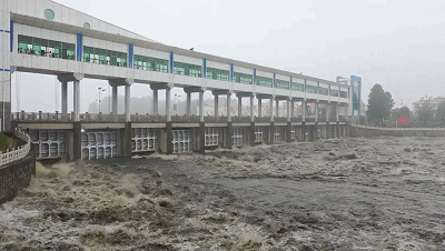 △7月20日,王家壩閘第16次開閘蓄洪,巨浪翻滾。(總臺(tái)央視記者崔琦提供)