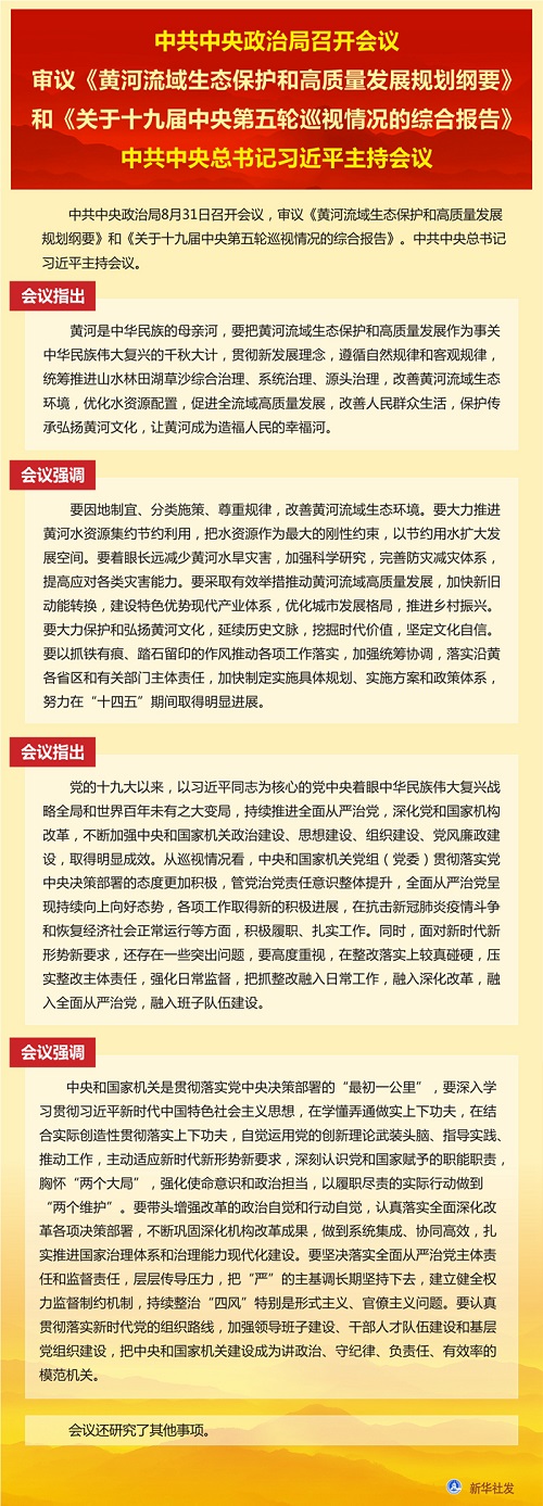 新華社北京8月31日電 中共中央政治局8月31日召開(kāi)會(huì)議,審議《黃河流域生態(tài)保護(hù)和高質(zhì)量發(fā)展規(guī)劃綱要》和《關(guān)于十九屆中央第五輪巡視情況的綜合報(bào)告》。中共中央總書記習(xí)近平主持會(huì)議。