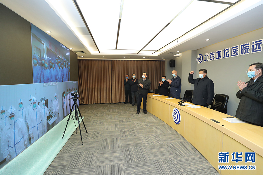 2月10日,習(xí)近平在北京調(diào)研指導(dǎo)新冠肺炎疫情防控工作。這是習(xí)近平在首都醫(yī)科大學(xué)附屬北京地壇醫(yī)院遠(yuǎn)程診療中心,通過視頻連線武漢市收治新冠肺炎患者的金銀潭醫(yī)院、協(xié)和醫(yī)院、火神山醫(yī)院,了解情況、聽取意見和建議,慰問一線醫(yī)務(wù)工作者。 新華社記者 鞠鵬 攝