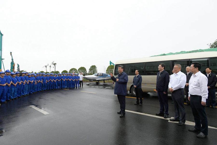 9月17日下午,習(xí)近平在長(zhǎng)沙市山河智能裝備股份有限公司生產(chǎn)車(chē)間,察看裝備制造流程,了解技術(shù)研發(fā)、生產(chǎn)制造情況。(新華社記者李學(xué)仁 攝)