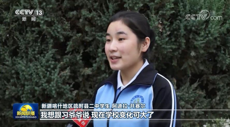 從設施到扶貧,從醫(yī)療到教育,發(fā)生在新疆的變化各族人民感同身受。疏附縣二中學生阿迪拉告訴記者,2014年4月,習近平總書記來學校看望師生,還跟大家合了影。站在總書記右手邊的就是阿迪拉,現(xiàn)在她已經(jīng)是一名高中生了。