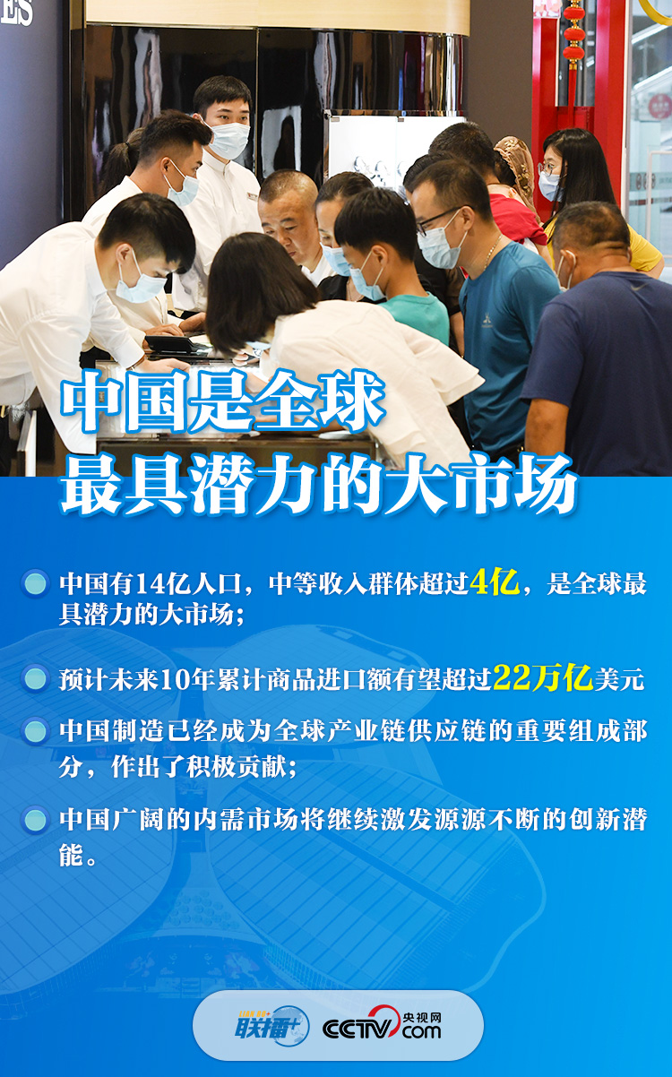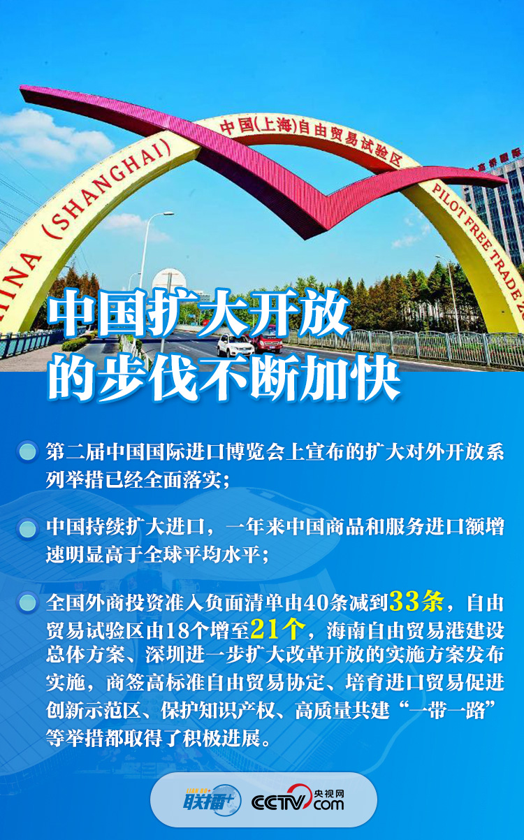 “各國企業(yè)參展踴躍,展覽面積又擴大了近3萬平方米”,“全國外商投資準入負面清單由40條減到33條,自由貿(mào)易試驗區(qū)由18個增至21個”,“中國有14億人口,中等收入群體超過4億,是全球最具潛力的大市場”......一組組數(shù)字振奮人心,體現(xiàn)了中國邀請各方“聚進博、享機遇”、推動世界經(jīng)濟復蘇的真誠愿望,展現(xiàn)了中國在大疫面前與各國“共天地、同風雨”的大國擔當。