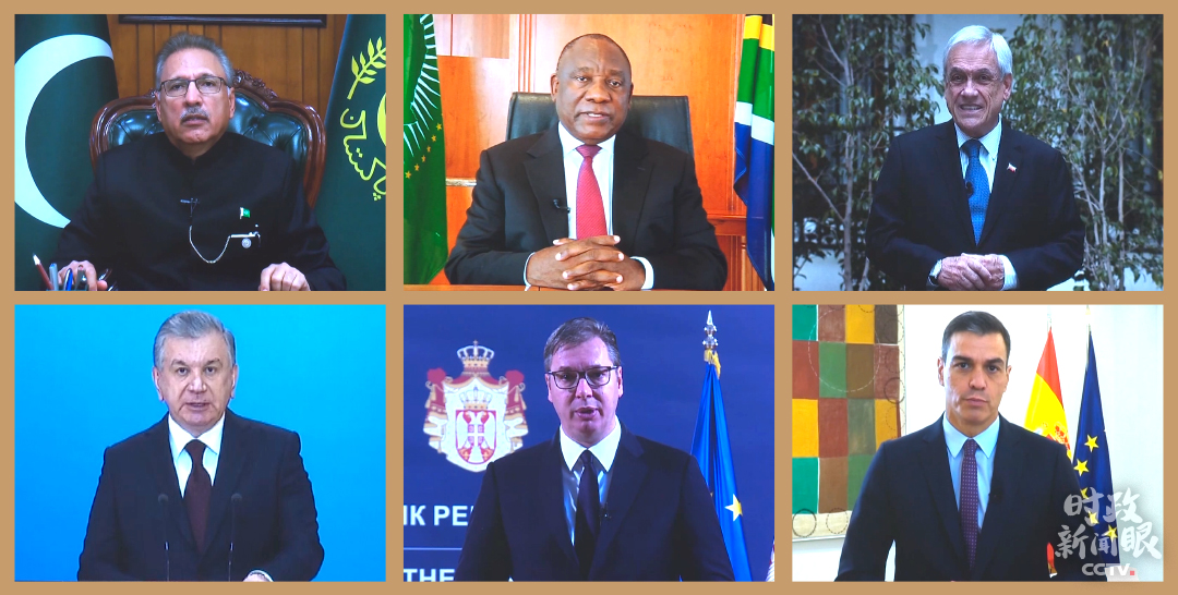 △開(kāi)幕式現(xiàn)場(chǎng),巴基斯坦總統(tǒng)阿爾維、南非總統(tǒng)拉馬福薩、智利總統(tǒng)皮涅拉、烏茲別克斯坦總統(tǒng)米爾濟(jì)約耶夫、塞爾維亞總統(tǒng)武契奇、西班牙首相桑切斯發(fā)表視頻致辭。