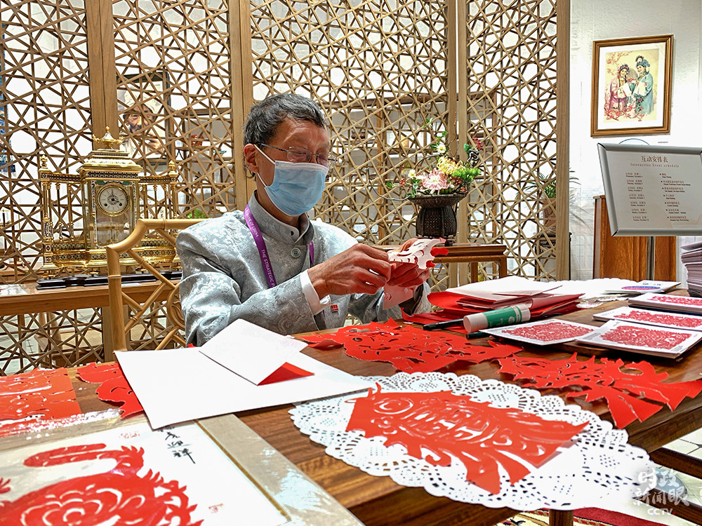 △這是上海市非遺海派撕紙項(xiàng)目代表性傳承人華興富,他可以徒手運(yùn)用撕、挖、摳、鏤等手法技巧,制作出栩栩如生的人像、生肖、窗花等撕紙作品。(總臺(tái)央視記者程鋮拍攝)