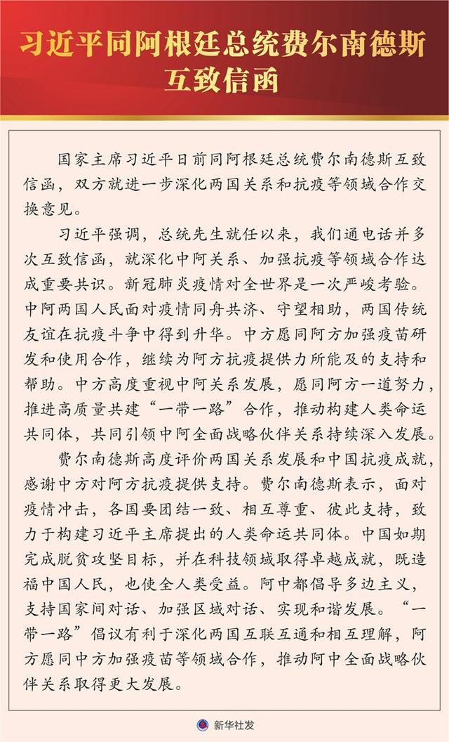 新華社北京1月4日電國家主席習(xí)近平日前同阿根廷總統(tǒng)費爾南德斯互致信函,雙方就進一步深化兩國關(guān)系和抗疫等領(lǐng)域合作交換意見。