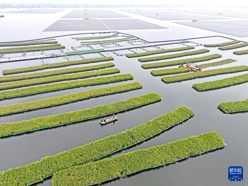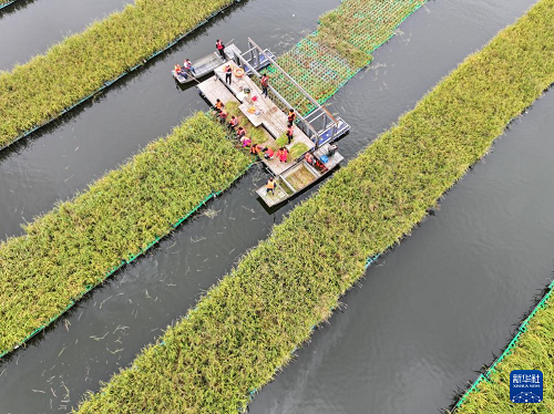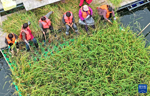 10月14日,工人在淮南市鳳臺(tái)縣顧橋鎮(zhèn)采煤沉陷區(qū)水面上收獲漂浮式水稻(無(wú)人機(jī)照片)。(新華社發(fā) 陳彬 攝)