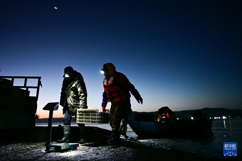 10月18日,庫區(qū)漁民將一箱剛捕撈的小銀魚上秤稱重。(新華社記者 齊芷玥 攝)