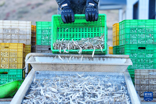 10月18日,在青海省海南藏族自治州共和縣龍羊新村龍羊峽海湖漁業(yè)捕撈合作社,工人收拾新捕的小銀魚。(新華社記者 齊芷玥 攝)