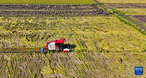 10月22日,種植戶在江蘇省連云港市贛榆區(qū)城官村田間收獲水稻(無人機(jī)照片)。(新華社發(fā) 耿玉和 攝)