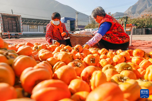 11月1日,河北省遵化市娘娘莊鎮(zhèn)蘆各寨西山村農民在場院挑選柿子。(新華社發(fā) 劉滿倉 攝)