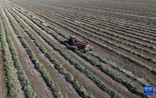 11月1日,工人駕駛拖拉機在甘肅山丹馬場二場田間翻曬燕麥草(無人機照片)。(新華社發(fā) 陳禮 攝)
