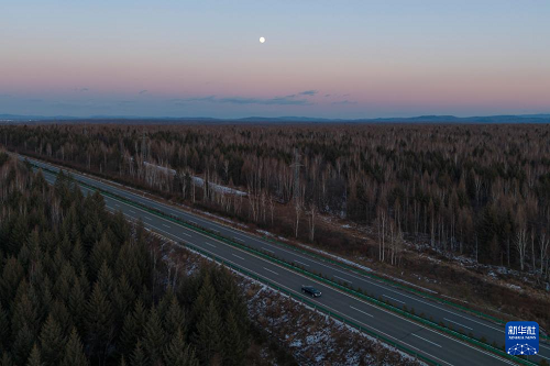 這是11月4日拍攝的黑龍江省伊春市豐林縣上空的月亮(無人機(jī)照片)。(新華社記者 謝劍飛 攝)