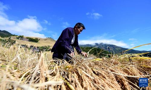 日前,廣西桂林市龍勝各族自治縣龍脊鎮(zhèn)大寨村種植的水稻進入收獲季節(jié),梯田之上呈現(xiàn)出一派忙碌的景象。