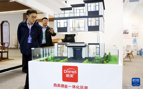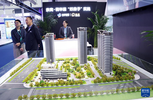 11月6日,參觀者在住博會上觀看展出的一體化民居模型。(新華社記者 潘旭 攝)
