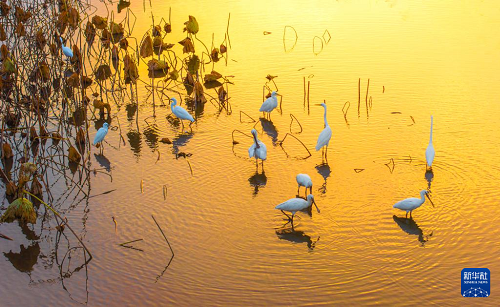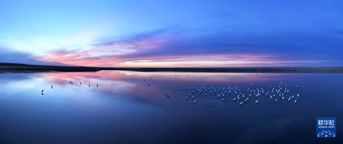在甘肅省酒泉市阿克塞哈薩克族自治縣,白鷺在冬不拉水庫(kù)棲息覓食(無人機(jī)照片,11月9日攝)。(新華社發(fā) 高宏善 攝)