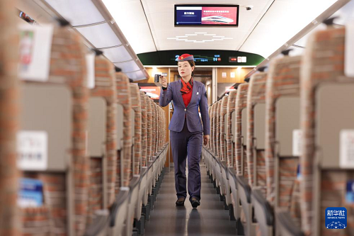 11月17日,乘務(wù)員在一列試驗(yàn)動(dòng)車(chē)組內(nèi)工作。(新華社發(fā) 賈智煒 攝)