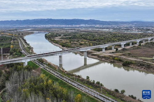 11月17日,一列試驗(yàn)動(dòng)車(chē)組通過(guò)西延高鐵渭河特大橋(無(wú)人機(jī)照片)。(新華社記者 張博文 攝)
