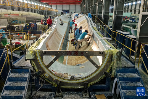 11月20日,在甘肅省酒泉經(jīng)濟(jì)技術(shù)開(kāi)發(fā)區(qū)的甘肅九鼎風(fēng)電復(fù)合材料有限公司成型車間,工作人員進(jìn)行風(fēng)機(jī)葉片鋪層作業(yè)(無(wú)人機(jī)照片)。(新華社記者 郎兵兵 攝)