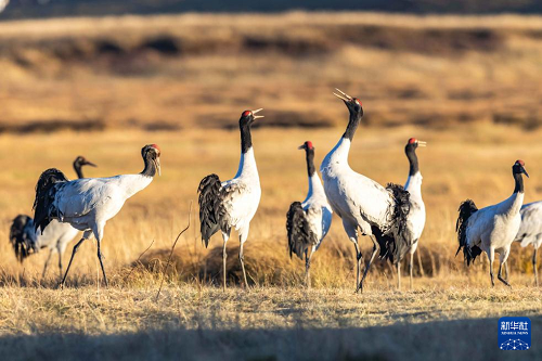 11月29日,黑頸鶴在大山包黑頸鶴國家級自然保護(hù)區(qū)內(nèi)的大海子濕地飛舞。(新華社發(fā) 陳熙 攝)
