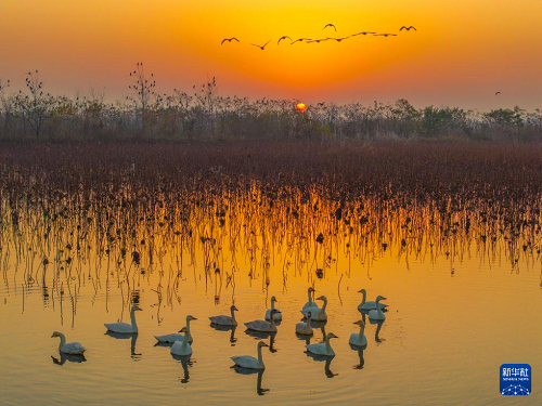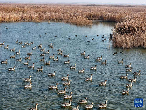 11月30日,群鳥在江蘇興化里下河國家濕地公園內(nèi)棲息、覓食(無人機(jī)照片)。(新華社發(fā) 周社根 攝)