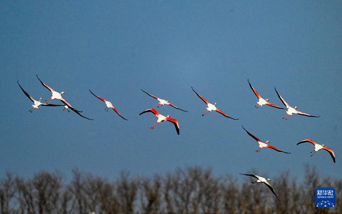 12月8日,火烈鳥在江蘇東臺條子泥濕地飛翔。(新華社發(fā) 孫家錄 攝)