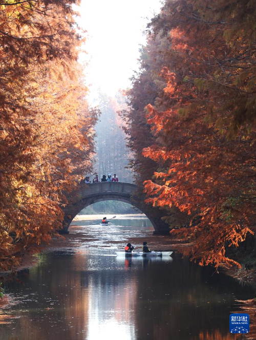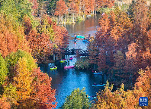 12月14日,人們在浙江省寧波植物園水杉林中揮槳戲水,樂享冬日暖陽(無人機照片)。(新華社發(fā) 胡學軍 攝)