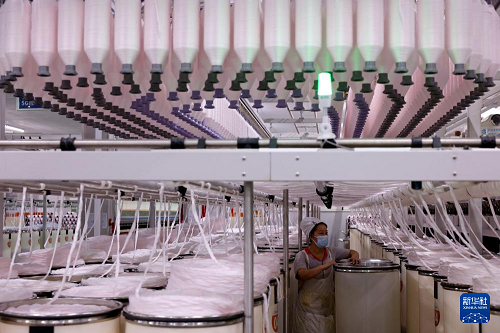 12月16日, 工人在山東棗莊經(jīng)濟(jì)開發(fā)區(qū)一家企業(yè)的智能化生產(chǎn)線上加工高端紗線。(新華社發(fā) 孫中喆 攝)