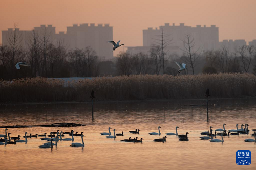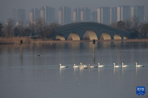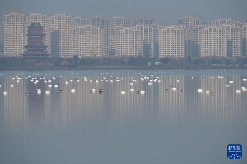 進入冬季,成群的候鳥飛抵安徽省滁州市明湖公園,在此休憩、覓食。明湖公園是一座融合自然景觀與人文景觀的城市公園,優(yōu)良的水質(zhì)、豐茂的水草和豐富的魚蝦資源,使這里逐漸成為天鵝等越冬候鳥和各種鳥類的棲息地。