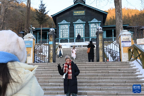 12月24日,游客在橫道河子鎮(zhèn)中東鐵路博物館前拍照。(新華社發(fā) 徐率 攝)