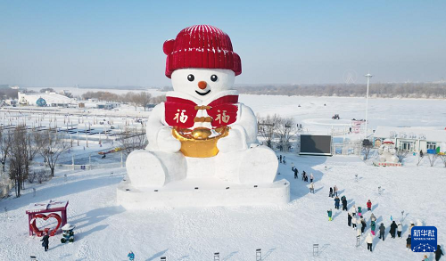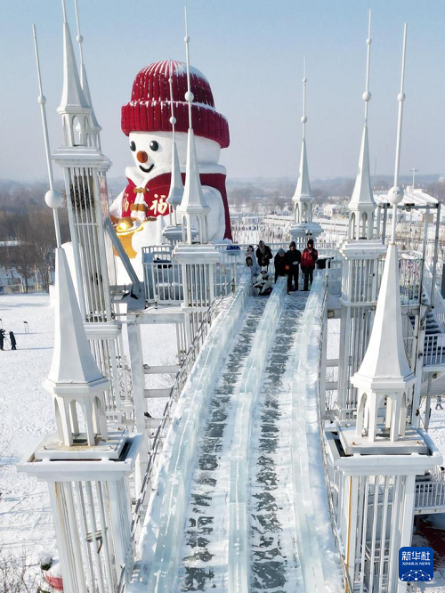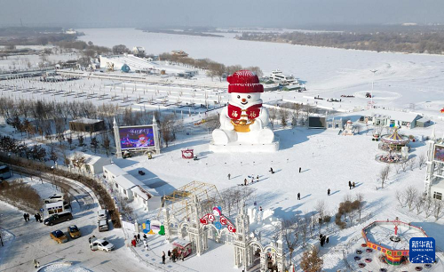12月24日在哈爾濱外灘德嘉雪人碼頭冰雪景區(qū)拍攝的大雪人(無人機照片)。(新華社發(fā) 劉洋 攝)