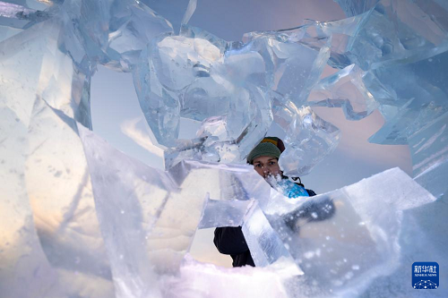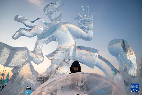1月3日,參賽選手在哈爾濱冰雪大世界園區(qū)內進行冰雕創(chuàng)作。(新華社記者 張濤 攝)