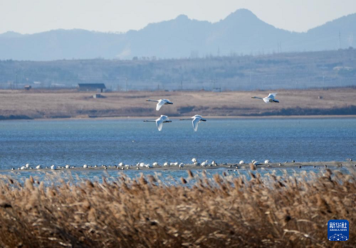 1月5日,大天鵝在榮成大天鵝國(guó)家級(jí)自然保護(hù)區(qū)棲息。(新華社記者 徐速繪 攝)