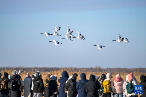 1月21日,游客在黑龍江扎龍國家級自然保護區(qū)內觀看丹頂鶴。(新華社記者 張濤 攝)