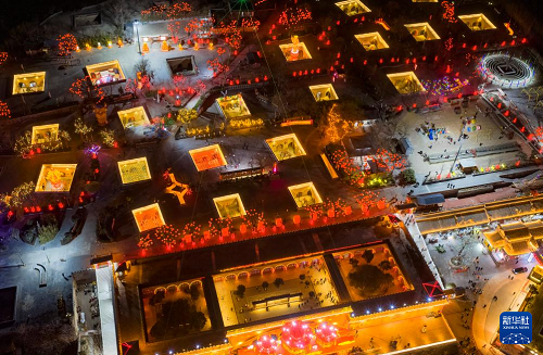2月10日,人們在河南省三門峽市陜州區(qū)地坑院景區(qū)欣賞花燈(無人機照片)。(新華社發(fā) 孫猛 攝)