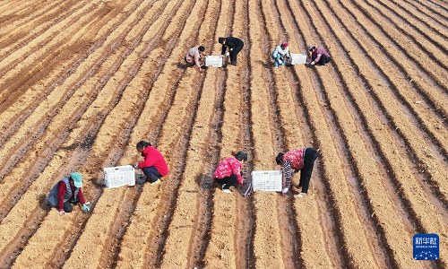 2月13日,在山東省棗莊市山亭區(qū)桑村鎮(zhèn),農(nóng)民在播種馬鈴薯(無人機(jī)照片)。(新華社發(fā) 李宗憲 攝)