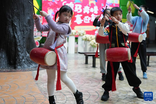 2月25日,小朋友在杭州青少年活動中心參加腰鼓隊(duì)巡游表演。(新華社記者 黃宗治 攝)