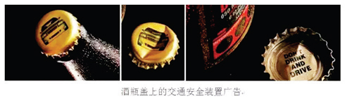 美國(guó)將警示語(yǔ)作為酒品包裝的強(qiáng)制性標(biāo)注內(nèi)容,要求飲料,酒的品牌標(biāo)簽、獨(dú)立的前標(biāo)簽或者背標(biāo)簽、側(cè)標(biāo)簽都應(yīng)獨(dú)立,并有別于標(biāo)簽中其他信息地標(biāo)示:“政府警示,根據(jù)普通外科醫(yī)生建議,孕婦不應(yīng)該飲酒,以防止新生兒缺陷,飲酒會(huì)減弱個(gè)人駕駛車(chē)或操控機(jī)械的能力并可能引發(fā)健康問(wèn)題?!贝送?國(guó)外的產(chǎn)品包裝設(shè)計(jì)上也植入了公益理念。如上圖廣告可對(duì)飲酒人群針對(duì)性的進(jìn)行廣告宣傳,采用打開(kāi)酒瓶蓋必須以破壞“車(chē)輛”為代價(jià)的形式,傳達(dá)喝酒不能開(kāi)車(chē)的安全理念。