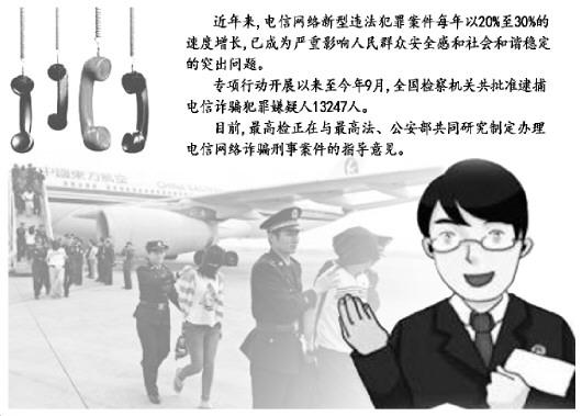 《法制日報(bào)》記者從最高人民檢察院與公安部近日聯(lián)合召開的電信網(wǎng)絡(luò)新型違法犯罪重點(diǎn)整治、突出地區(qū)督導(dǎo)會(huì)上了解到,被掛牌的7個(gè)重點(diǎn)地區(qū)和5個(gè)突出地區(qū)檢察機(jī)關(guān)積極主動(dòng)作為,出重拳、下重手、用重典,快速批捕起訴了一批有震動(dòng)、有影響的重大電信網(wǎng)絡(luò)詐騙犯罪案件,取得了初步成效。據(jù)統(tǒng)計(jì),專項(xiàng)行動(dòng)開展以來至今年9月,全國檢察機(jī)關(guān)共批準(zhǔn)逮捕電信詐騙犯罪嫌疑人13247人。