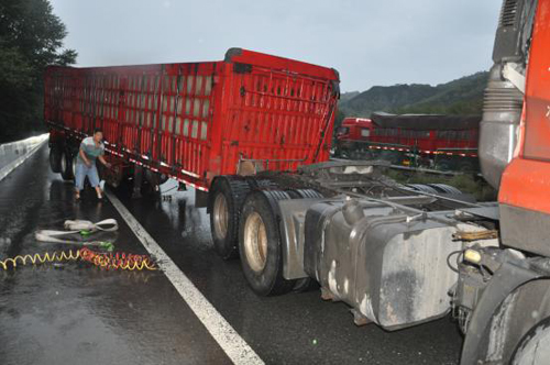 2017年08月26日19時00分許,高速二支隊(duì)九大隊(duì)民警翟躍、郭騏源接到報警稱:在五保高速8km處,有一輛紅色東風(fēng)牌重型半掛貨車因出車前未檢查車輛,駕駛存在安全隱患的車輛上路行駛,將掛車脫落,后與中央護(hù)欄發(fā)生碰撞,造成車輛及路產(chǎn)不同程度損壞的道路交通事故。大隊(duì)民警第一時間趕赴現(xiàn)場,只有超車道可以通行,在做好安全防護(hù)的情況下,及時詢問當(dāng)事人是否受傷,是否需要撥打“120”急救,并了解了當(dāng)時的事發(fā)情況。當(dāng)事人稱:“自己一個人開車去陜西拉煤,走的時候著急,沒檢查車輛,在行駛過程中,就感覺車輛掛車在擺動,因?yàn)槭怯晏?,也沒在意,行駛到8km處時,踩剎車過急,加之路面濕滑,掛車突然脫落與中央護(hù)欄發(fā)生碰撞,所幸人沒有受傷?!敝?,民警對現(xiàn)場進(jìn)行勘查,并調(diào)取監(jiān)控視頻,發(fā)現(xiàn)車輛在剎車時,車速較快,駕駛員駕駛存在安全隱患的車輛是造成事故發(fā)生的原因。