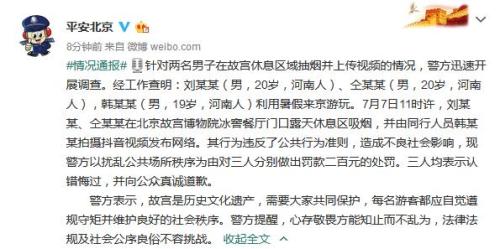通報(bào)稱,經(jīng)工作查明:劉某某(男,20歲,河南人)、仝某某(男,20歲,河南人),韓某某(男,19歲,河南人)利用暑假來京游玩。7月7日11時(shí)許,劉某某、仝某某在北京故宮博物院冰窖餐廳門口露天休息區(qū)吸煙,并由同行人員韓某某拍攝抖音視頻發(fā)布網(wǎng)絡(luò)。其行為違反了公共行為準(zhǔn)則,造成不良社會影響,現(xiàn)警方以擾亂公共場所秩序?yàn)橛蓪θ朔謩e做出罰款二百元的處罰。三人均表示認(rèn)錯悔過,并向公眾真誠道歉。