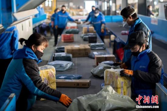 資料圖:工作人員分揀快遞包裹。中新社記者 韋亮 攝