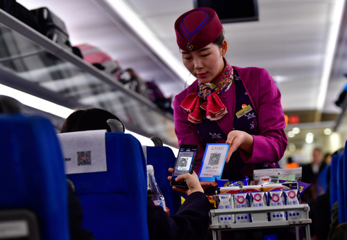 圖為在重慶客運段G8516次列車上,一名旅客在使用手機掃碼支付購買飲用水。新華社記者 劉潺 攝