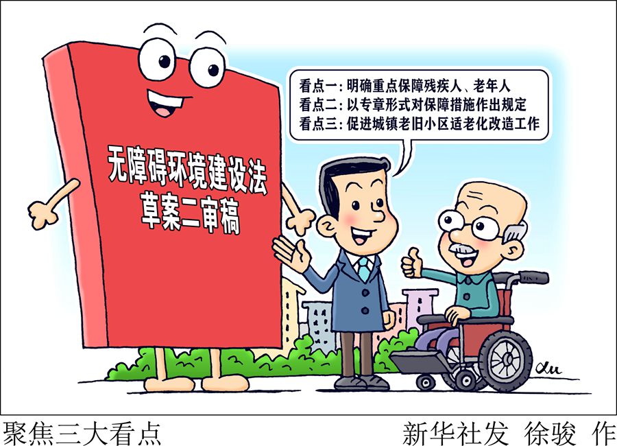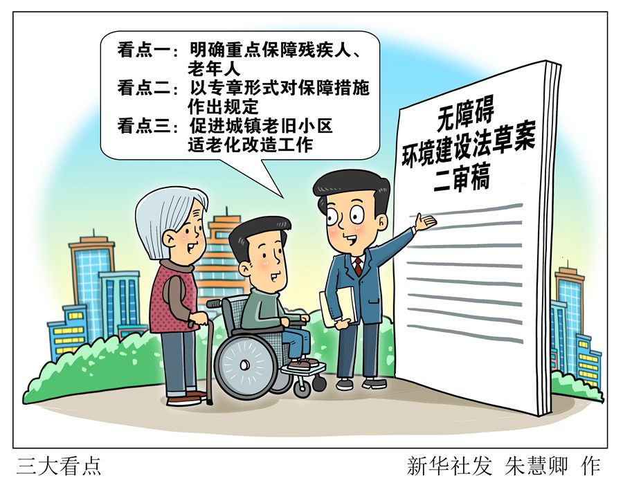 去年10月草案一審稿提請(qǐng)審議后,征求各方面意見。此次提請(qǐng)十四屆全國人大常委會(huì)第二次會(huì)議審議的草案二審稿,吸納各方面意見建議,突出無障礙環(huán)境建設(shè)基本定位,增加“保障措施”專章,進(jìn)一步完善城鎮(zhèn)老舊小區(qū)無障礙設(shè)施和適老化改造中加裝電梯問題有關(guān)規(guī)定,在“重點(diǎn)”“難點(diǎn)”問題上精準(zhǔn)“出招”。