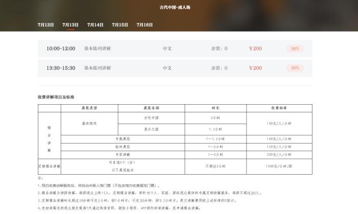 古代中國展收費(fèi)講解項(xiàng)目及標(biāo)準(zhǔn) 截圖自國家博物館官網(wǎng)