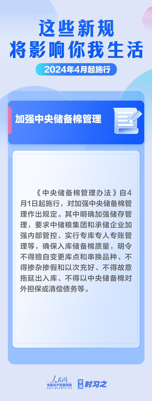 加強中央儲備棉管理;明確托育機構質量評估標準;規(guī)范可再生能源電量收購……4月起,這些新規(guī)施行,將影響你我生活。(薄晨棣)